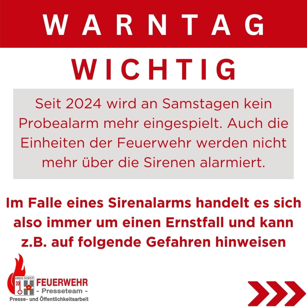 An dieser Stelle folgender Hinweis – Im Kreis Soest werden Sirenen seit 2024 nur noch zur Warnung der Bevölkerung genutzt und nicht mehr zur Alarmierung der Feuerwehr.