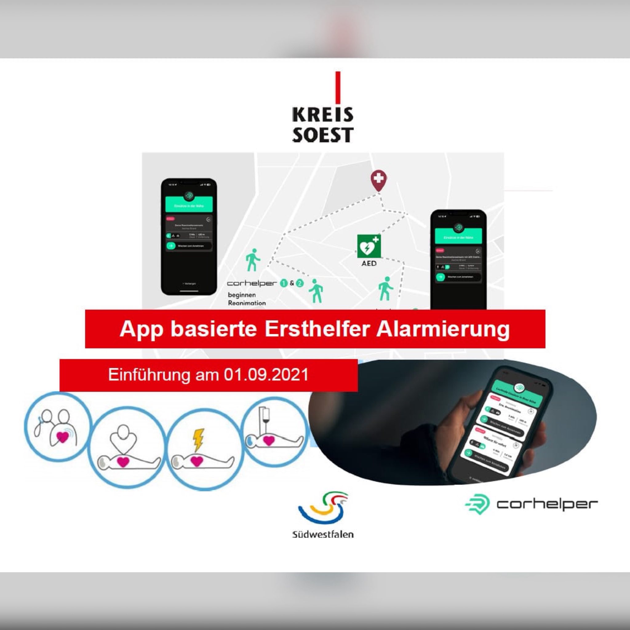 Bei der Anwendung handelt es sich um eine App basierte Ersthelfer Alarmierung, die registrierte Nutzerinnen und Nutzer bei einem Reanimationsnotfall in ihrer Nähe alarmiert. Ziel ist es, schnell qualifizierte Hilfe zu leisten, noch bevor der Rettungsdienst eintrifft. Die App wurde im September 2021 im Kreis Soest eingeführt.